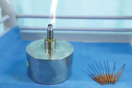 现代火针针具用钨钢特制而成,操作时经酒精灯的加热,采用一定手法迅速刺入穴位,有时可在穴位及其周围多次点刺,以加强治疗效果。